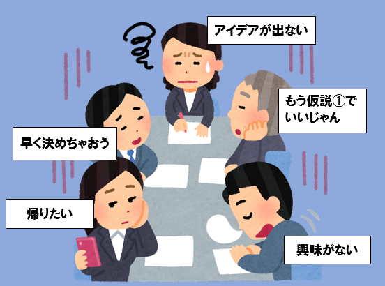 会議も同じです。みんなが「早く会議を終わりたい」と思っていると最初の仮説に飛びついて終わってしまいます。
