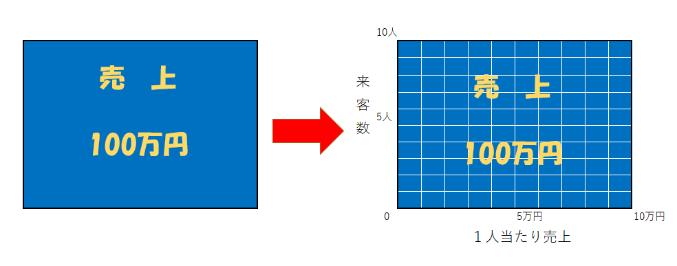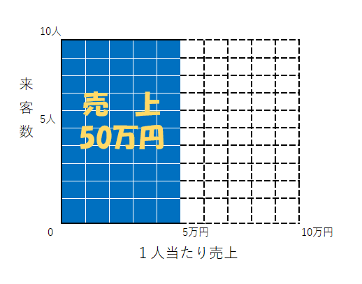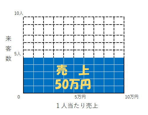 売り上げが半分に下がったとして、「お客さんの数」と「1人当たり売上」分けて考えると次のようになります。