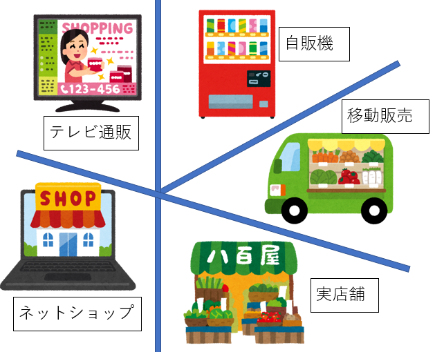 小売業だとまず「直営店」「ネット販売」「通信販売」「委託販売」などに切り分けます。