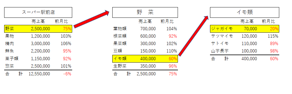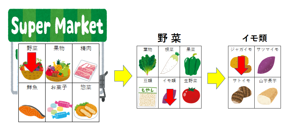 ふつうは「野菜が大きく落ちた」→「イモ類が大きく落ちた」→「ジャガイモが大きく落ちた」